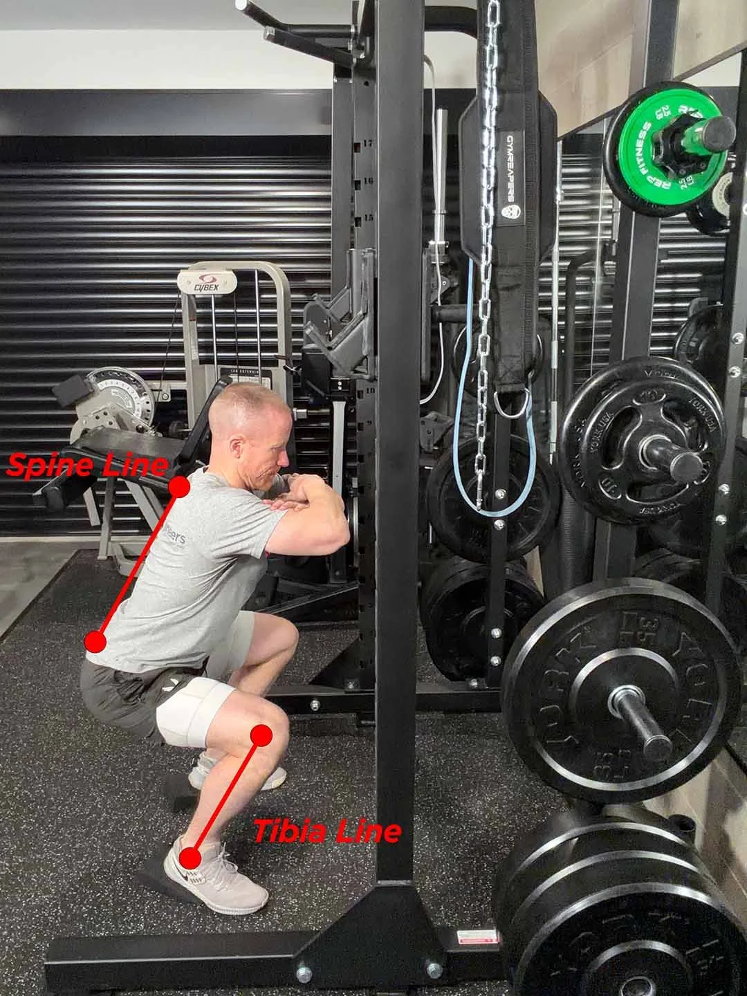 Figure 1: Heels elevated bodyweight squat. Use this to determine safety pin height and foot stance. Note for good form the spine and shin should be parallel.